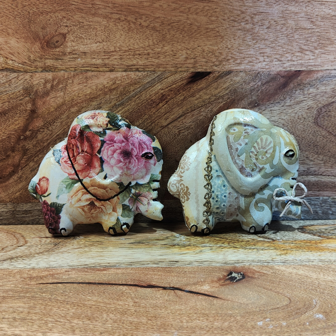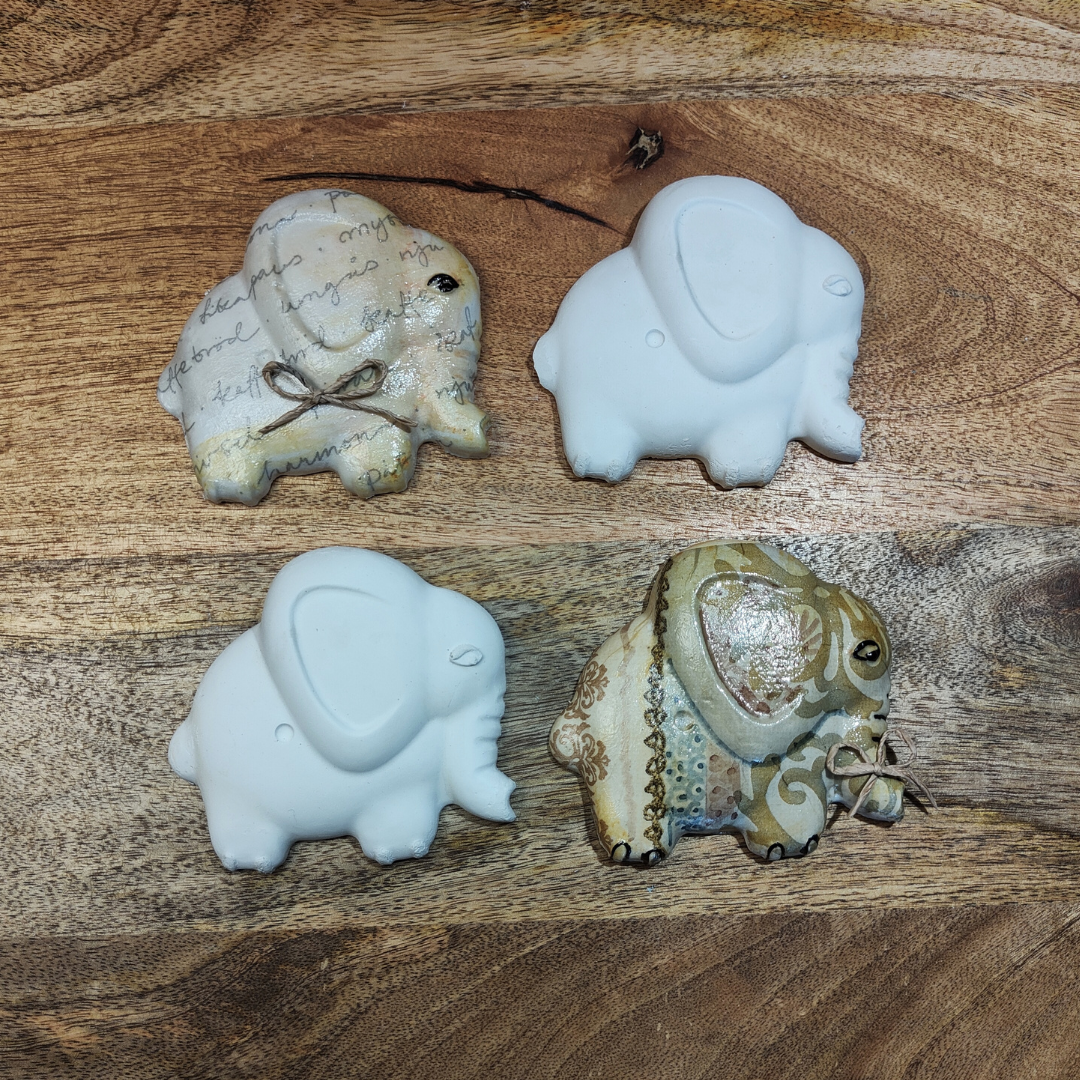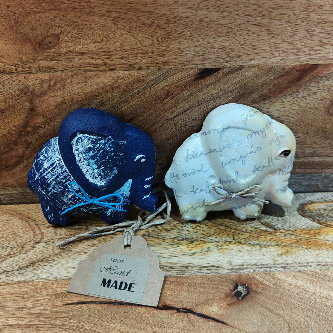Figurka gipsowa w kształcie słonia ( wym. 10×9 cm)w pudełku kartonowym z okienkiem z wyściółką, przewiązana sznurkiem papierowym.