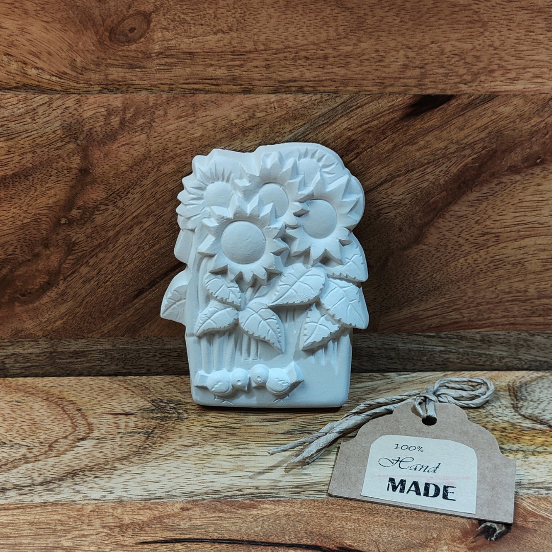Figurka gipsowa (wym. 10×7 cm) w kształcie obrazka z motywem łąki w pudełku kartonowym z przeźroczystą pokrywką, przewiązane sznurkiem jutowym.