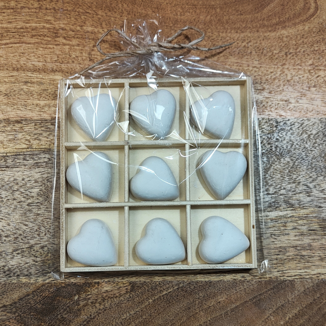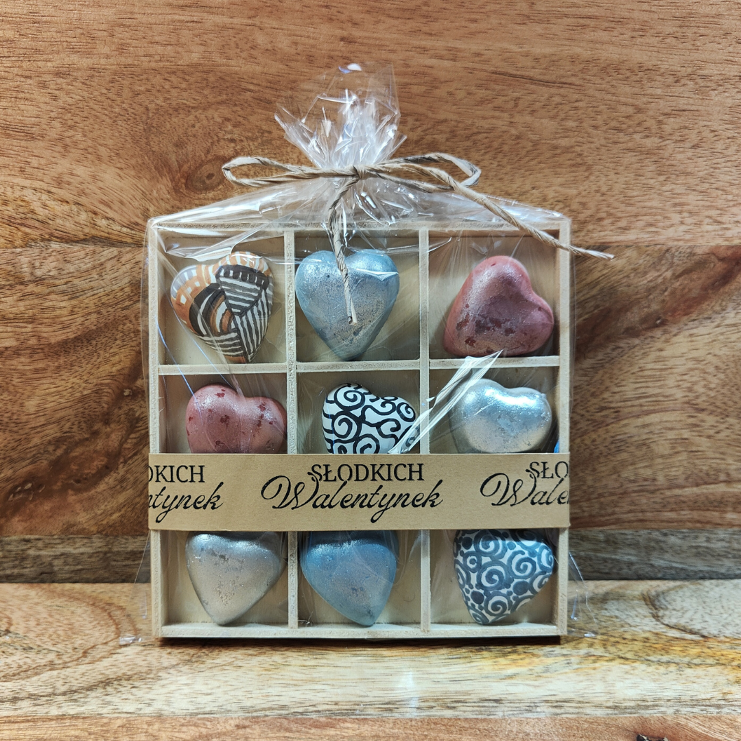 Zestaw gipsowych serduszek 9 szt. w drewnianym pudełku z przegródkami, zapakowany w woreczek foliowy, przewiązany papierowym sznurkiem.